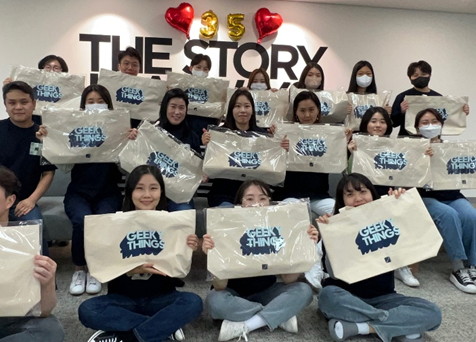 한국 지사는 자체적으로 팀 티셔츠를 맞추며 35주년을 기념했습니다. 티셔츠 앞면 오른쪽 상단에 위치한 호프만에이전시 QR코드를 통해 호프만에이전시 코리아 페이지로 바로 이동할 수 있다는 것이 특징입니다. 또한 뒷면 디자인도 심플하면서 긱스럽습니다. “Just Keep Going”을 변형한 “Just Geek Going” 문구 디자인이 포인트입니다.