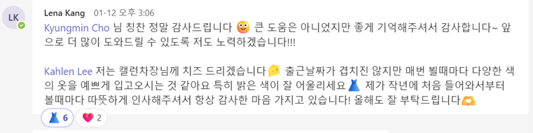 실제로 이벤트가 진행되는 한 주 동안 팀원들의 성격, 의상, 업무 등 다양한 주제와 관련한 따뜻한 칭찬들로