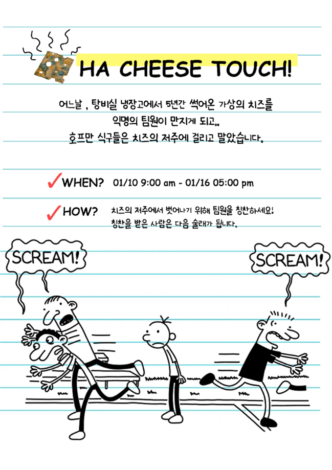 해당 이벤트는 ‘The Diary of a Wimpy Kid’에 등장하는 ‘Cheese Touch’를 모티브로 하여