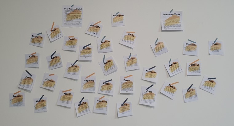 실제로 이벤트가 진행되는 한 주 동안 팀원들의 성격, 의상, 업무 등 다양한 주제와 관련한 따뜻한 칭찬들로