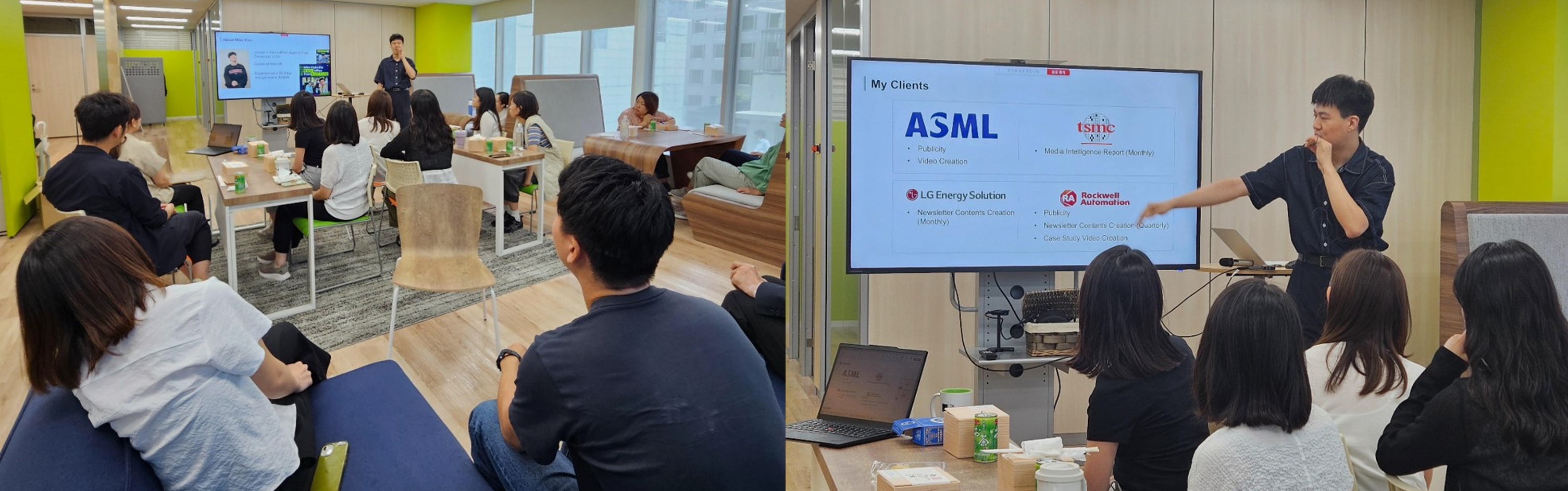 김중곤 대리는 이번 세션에서 ‘한국 반도체 기업의 언론 홍보 사례 공유 및 인사이트 공유’라는 주제로 Knowledge Sharing 발표를 진행했는데요. 김중곤 대리는 2년 넘게 글로벌 반도체 기업 ASML 언론 홍보를 담당하고 있으며, TSMC의 한국 미디어 관련 Intelligence Report 업무를 담당했습니다.