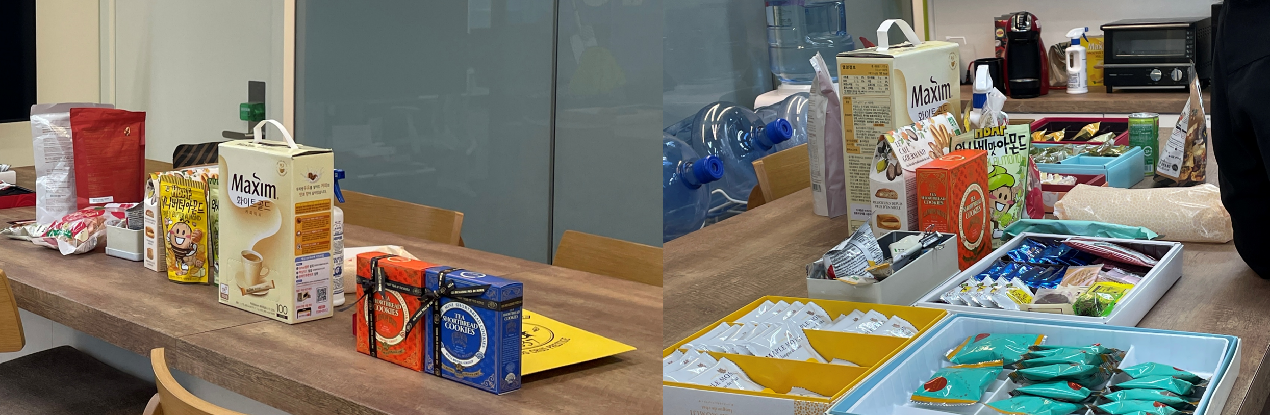 호프만코리아에서 도쿄 오피스 팀원들을 위해 준비한 소소한 간식입니다. 도쿄 오피스가 동아시아 허브 오피스여서 그런지 다양한 국적의 간식들이 눈에 띄었습니다! 참고로, 도쿄 오피스 팀원들은 허니버터아몬드를 굉장히 좋아했다고 하네요!