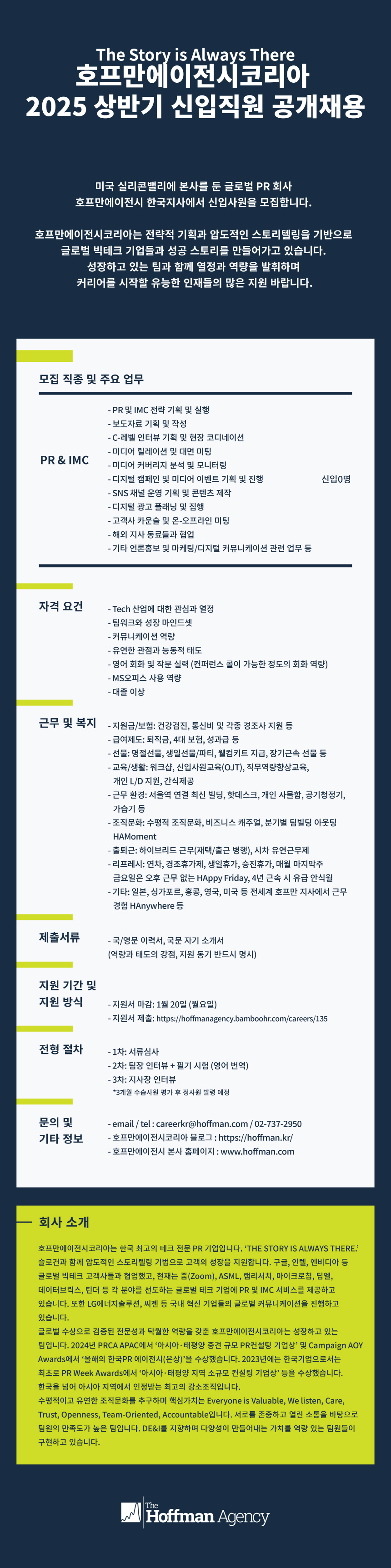 미국 실리콘밸리에 본사를 둔 글로벌 PR 회사 호프만에이전시 한국지사에서 신입사원을 모집합니다. 호프만에이전시코리아는 전략적 기획과 압도적인 스토리텔링을 기반으로 글로벌 빅테크 기업들과 성공 스토리를 만들어가고 있습니다. 성장하고 있는 팀과 함께 열정과 역량을 발휘하며 커리어를 시작할 유능한 인재들의 많은 지원 바랍니다.
