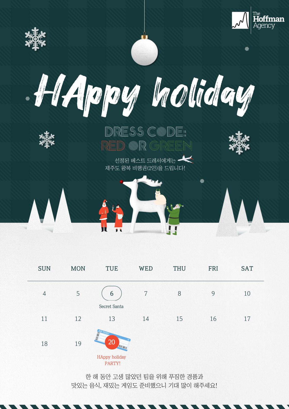 2022년 호프만 에이전시의 연말 파티 콘셉트는 “HAppy Holiday”였습니다. 맛있는 음식과 풍성한 선물, 즐거운 게임으로 HAPPY HAppy했던 파티 현장을 소개하겠습니다😊