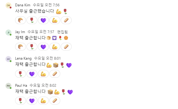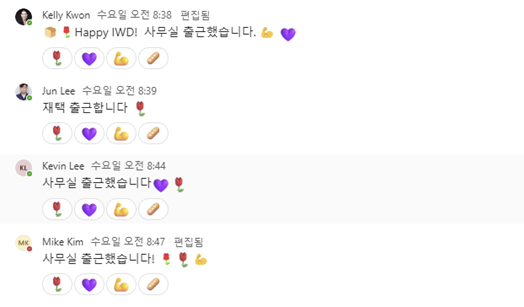 3월 5일, 팀즈(Teams)에서 세계 여성의 날을 상징하는 이모지(💜 💪 🌹 🥖)를 활용해 출근 인사를 나누며 하루를 시작했습니다. 너무 귀엽지 않나요?