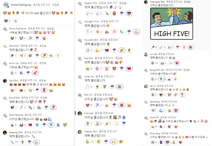 6월 20일 '가장 행복한 날'에 호프만 에이전시의 출근 챗이 화려한 이모티콘으로 가득 채워졌답니다! 알록달록, 본인이 좋아하는 것들로 가득한 출근 챗 너무 귀엽지 않나요? 일주일 중 가장 마지막 날, 힘든 출근을 귀여운 이모티콘들로 함께 잘 극복했답니다.