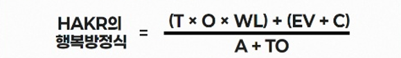이 방정식에서 HAKR의 행복(H)은 신뢰(T), 개방성(O), 팀워크(WL)에서 비롯된 긍정적인 에너지에, 서로 존중하고 배려하는 마음(EV + C)이 더해집니다. 그리고 각자의 책임감(A)으로 균형을 이루며, 협업의 즐거움(TO)까지 더해져 모두가 함께 성장하고 행복을 만들어가는 조직 문화를 뜻해요.