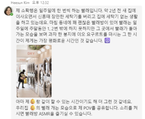 임직원들이 각자의 ‘소확행’을 챗에 자유롭게 공유하는 시간을 가졌어요. 빨래방에서 기다리며 과자와 요구르트를 먹는 시간, 연차 날에 좋아하는 친구와 평냉 오픈런, 귀여운 선인장과 하늘을 함께 감상하는 순간, 날씨에 맞는 유튜브 플레이리스트, 오늘의 소중한 커피 한 잔, 아버지의 날을 기념해 받은 아들의 귀여운 카드, 안양시백일장 참석, 고양이와 강아지들과 함께하는 소중한 시간까지! 정말 다양한 소확행이 공유되었습니다.