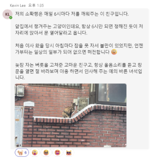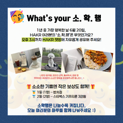 임직원들이 각자의 ‘소확행’을 챗에 자유롭게 공유하는 시간을 가졌어요. 빨래방에서 기다리며 과자와 요구르트를 먹는 시간, 연차 날에 좋아하는 친구와 평냉 오픈런, 귀여운 선인장과 하늘을 함께 감상하는 순간, 날씨에 맞는 유튜브 플레이리스트, 오늘의 소중한 커피 한 잔, 아버지의 날을 기념해 받은 아들의 귀여운 카드, 안양시백일장 참석, 고양이와 강아지들과 함께하는 소중한 시간까지! 정말 다양한 소확행이 공유되었습니다.