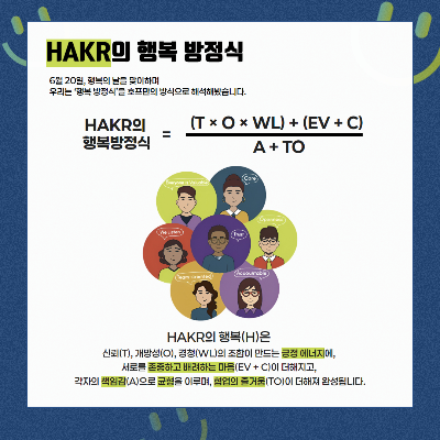 이 방정식에서 HAKR의 행복(H)은 신뢰(T), 개방성(O), 팀워크(WL)에서 비롯된 긍정적인 에너지에, 서로 존중하고 배려하는 마음(EV + C)이 더해집니다. 그리고 각자의 책임감(A)으로 균형을 이루며, 협업의 즐거움(TO)까지 더해져 모두가 함께 성장하고 행복을 만들어가는 조직 문화를 뜻해요.
