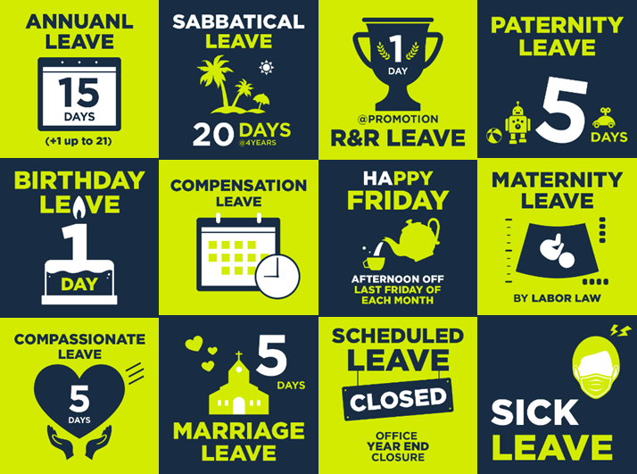 - SABBATICAL LEAVE: 4년 이상 근속한 직원에게 1달의 안식월을 제공함으로써 열심히 일한 직원이 재충전할 수 있는 시간을 제공합니다.
