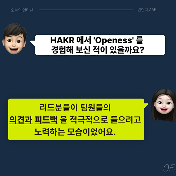 HAKR에서도 지금처럼 다양한 소통 방식을 꾸준히 고민하고, 팀원들의 다양한 의견을 적극적으로 수용해 실제 변화로 이어 나간다면, 더 개방적이고 협력적인 조직 문화가 자연스럽게 정착될 수 있다고 생각합니다.