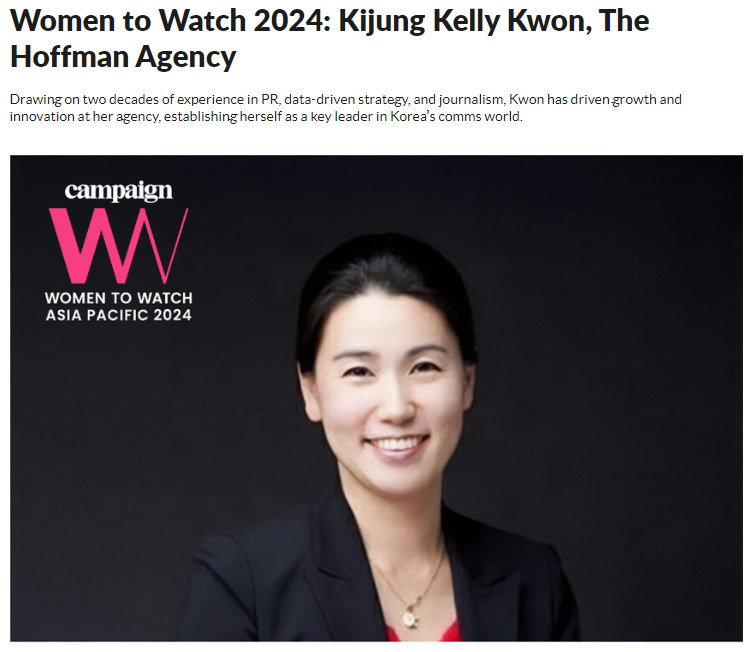 호프만에이전시코리아의 권기정 대표가 아시아-태평양 마케팅 및 PR 업계를 혁신적으로 이끄는 여성 리더를 조명하는 ‘캠페인 아시아 Women to Watch 2024’에 선정됐다. 권 대표는 20년간 저널리즘과 데이터 기반 마케팅에서 쌓은 경험을 바탕으로 업계의 성장을 이끌며 주목받고 있다.
